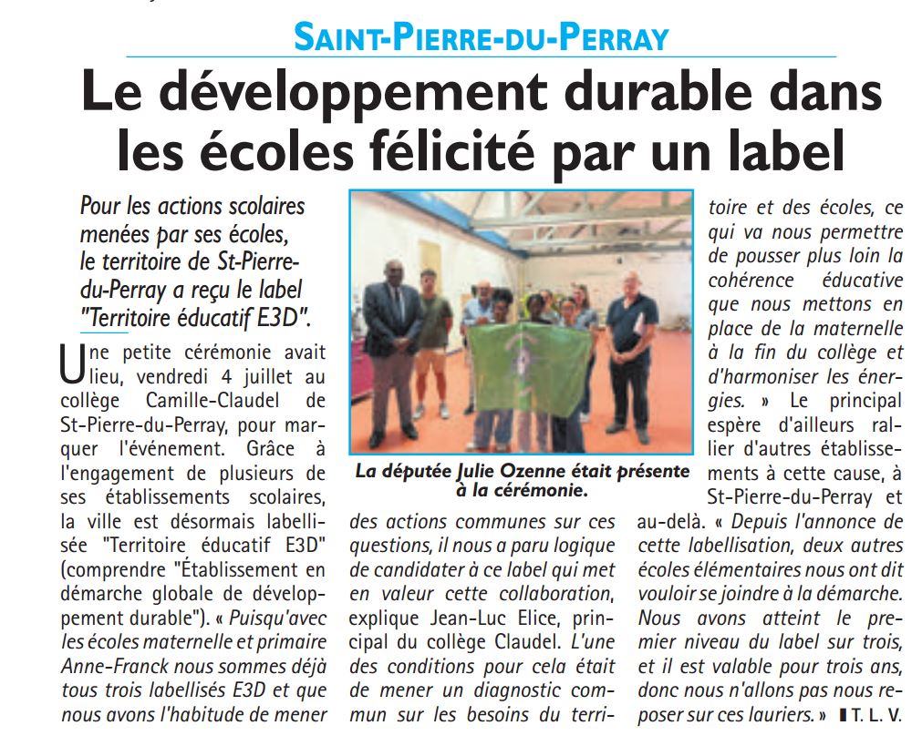Nous sommes heureux de vous annoncer que notre territoire de Saint-Pierre du Perray a obtenu le label TERRITOIRES EDUCATIFS E3D niveau 1 ( Territoire engagé) grâce à la dynamique impulsée par nos 3 établissements labellisés E3D ( école maternelle (...)
